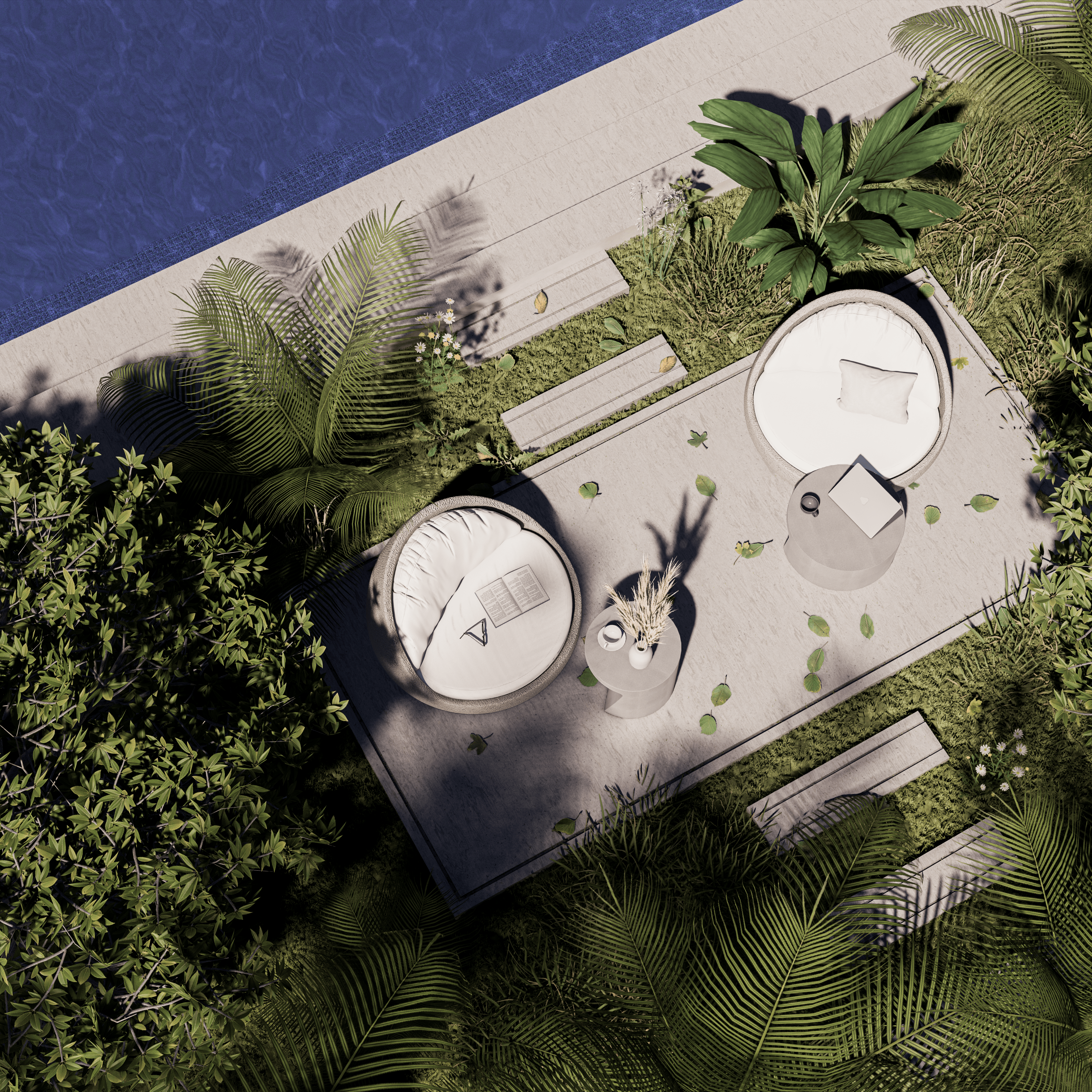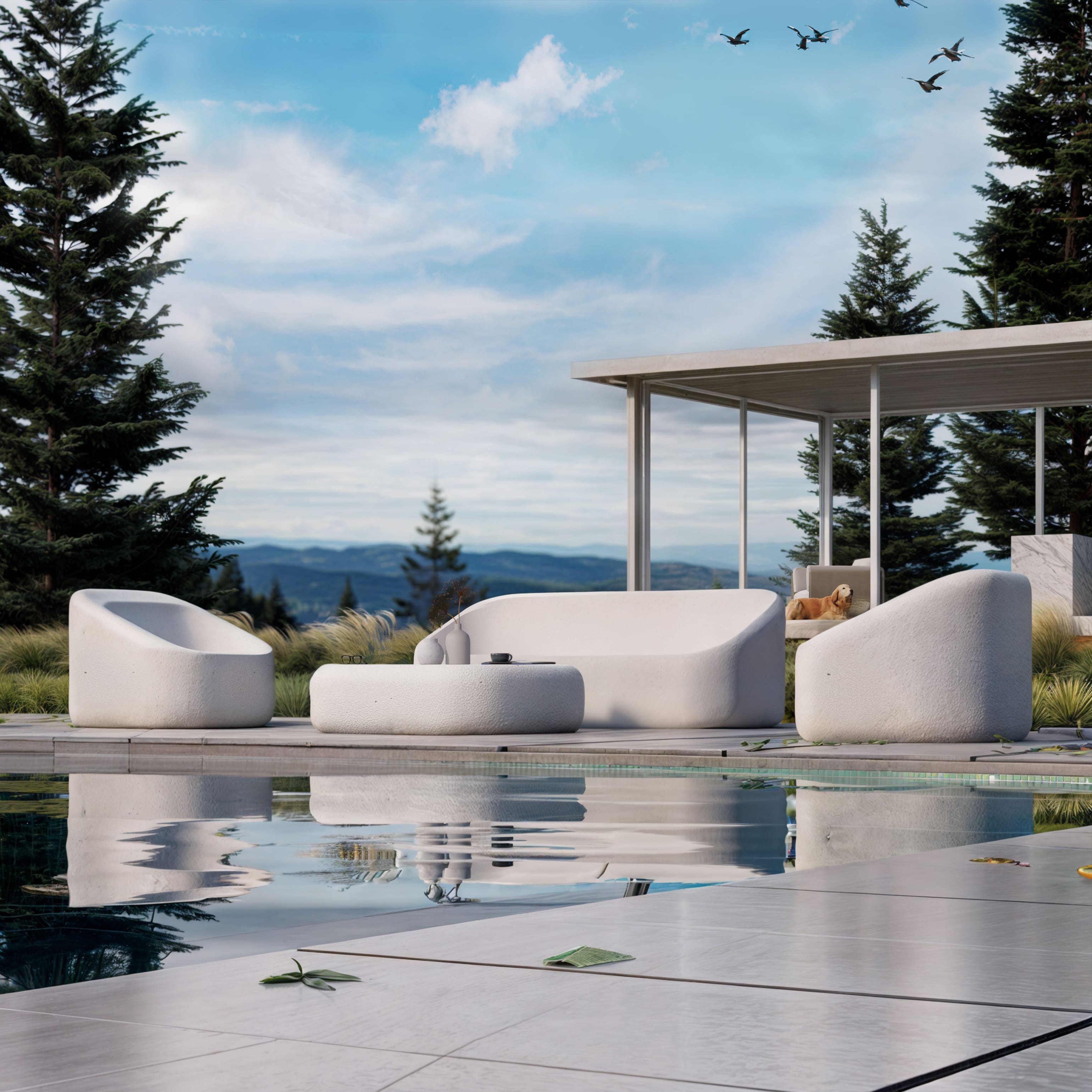 Este primer espacio muestra una tendencia contemporánea y minimalista para exteriores. El mobiliario de líneas suaves y curvas orgánicas destaca por su simplicidad y elegancia, con una paleta de colores neutros que resaltan la pureza y serenidad del espacio. Las formas redondeadas de los muebles, junto con la textura sólida y lisa, aportan un aire moderno y acogedor, ideal para un entorno al aire libre relajado.